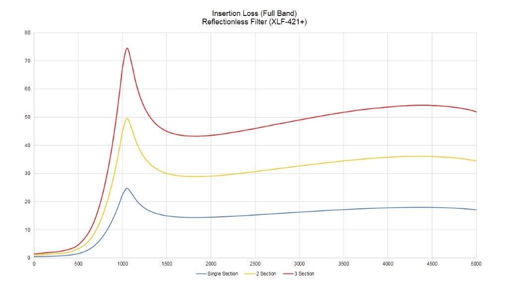 - איור 5b: הפסדי מעבר של XLF-421+ עבור 1, 2 ו- 3 חוליות על פני פס הבדיקה כולו