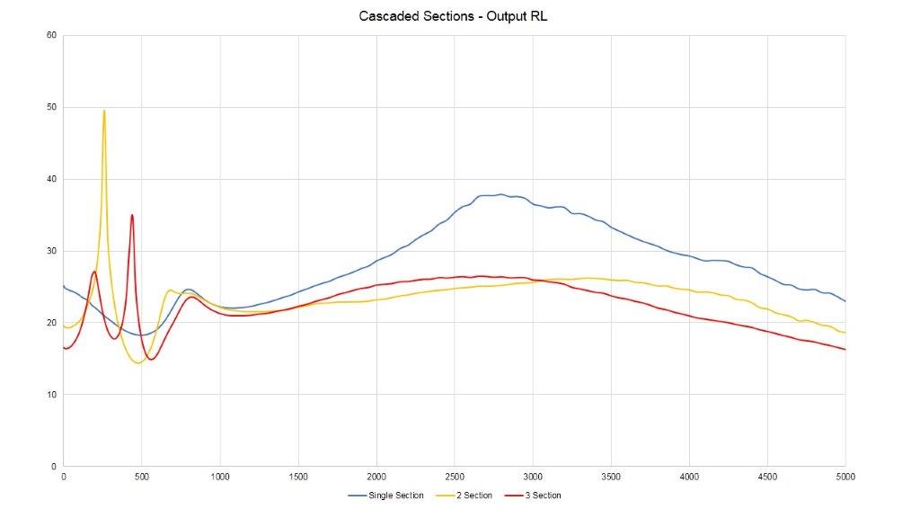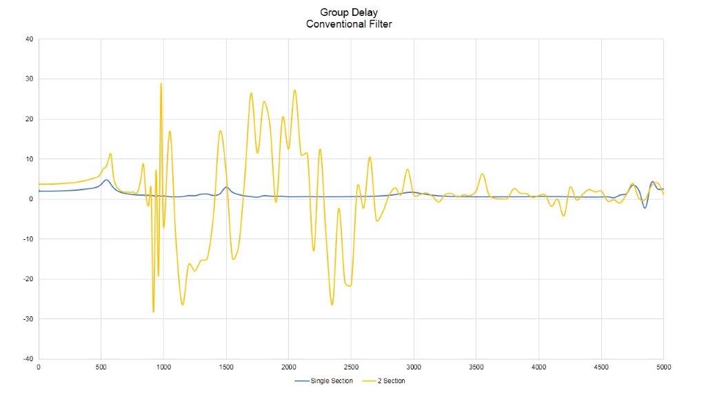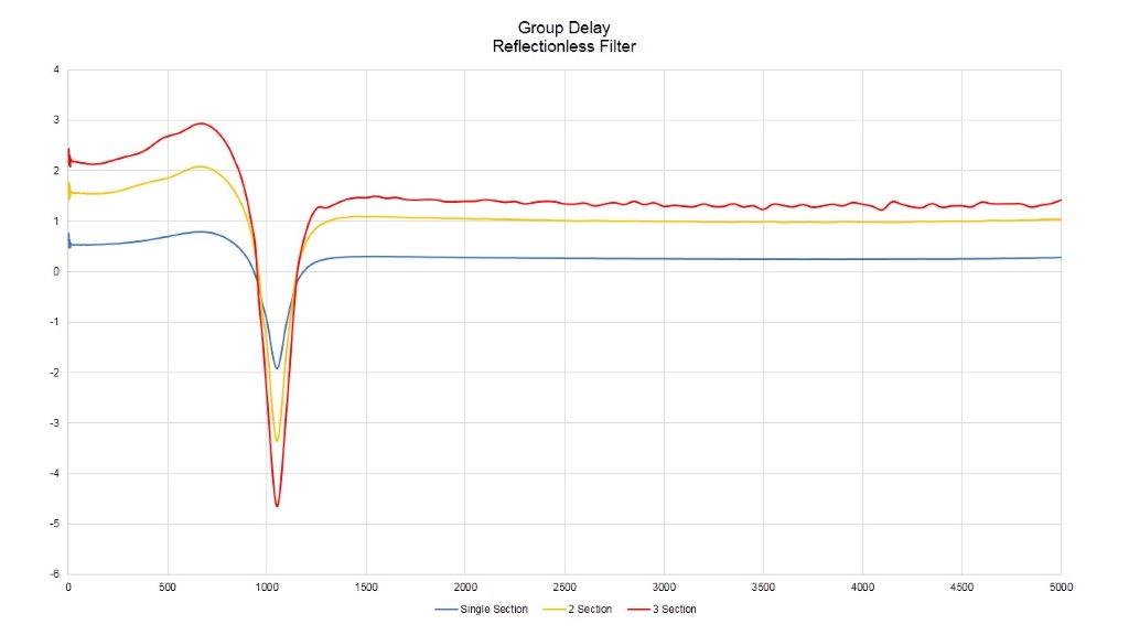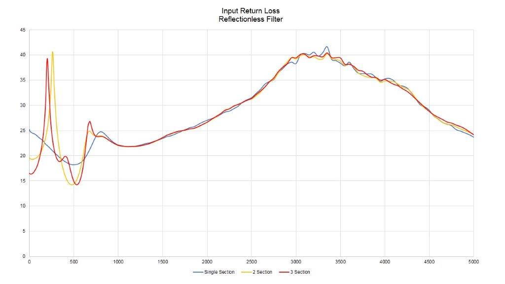 על מנת לאמת עוד את היתרונות של מסננים ללא החזרות שמחוברים בתצורה טורית, נערכה בדיקה להשוואה של המסנן ללא החזרות דגם XLF-421+ למסנן קונבנציונלי דגם NLP-550+ כאשר הוא מחובר בטור. היחידות הולחמו על מעגלי בדיקה ומעגלי הבדיקה חוברו ביניהם בטור וחוברו אל נתח רשתות וקטורי, תוך הפעלה של הארכת חיבורים אוטומטית. המסנן ללא החזרות נבדק עבור 1, 2 ו-3 חוליות, והמסנן הקונבנציונלי נבדק עבור 1 ו -2 חוליות. הפסדי המעבר, הפסדי ההחזרה בכניסה וביציאה והשהיית החבורה נסרקו על פני טווח מ-DC עד 5000 מגה הרץ עבור כל מבנה. נתוני המדידות מוצגים באיורים 5a עד 5j. עקומות הפסדי המעבר של מסנן קונבנציונלי מציגות גידול צפוי בדחייה בפס החסימה, כאשר שני מסננים מחוברים בטור. ואולם, אדווה ברורה מופיעה על פני פס החסימה בעקומה של שתי החוליות. הסיבה לכך היא יחס פאזות לא יציב בין האות העובר לאות החוזר. בנוסף, אדווה לא רצויה מופיעה בפס ההעברה סמוך לקצה הפס בעקומת שתי החוליות. זוהי תוצאה של קלקול הנובע מהפסדי החזרה בפס ההעברה ומהחזרות במעבר. בניגוד לכך, הביצועים של הפסדי מעבר עבור מסנן ללא החזרות חוזרים על עצמם יפה מאוד כאשר מחברים בטור שני חלקים ושלושה חלקים, ללא כל אדוות או עיוותים, שנראו בחיבור של המסנן הקונבנציונלי.האיורים 5e עד 5h מציגים את ההשפעה על הפסדי החזרה של שני סוגי המסננים כפונקציה של מספר החוליות. המסנן הקונבנציונלי מציג קלקול משמעותי בהפסדי ההחזרה שבכניסה וביציאה בפס ההעברה, כאשר שתי חוליות חוברו בטור – ב-20dB בקירוב בכמה מהאזורים.מצד שני, כאשר שתי חוליות של מסנן ללא החזרות מחוברות בטור, הפסדי החזרה בכניסה וביציאה משתנים על פני פס ההעברה, אבל אותו קלקול לא ניכר, ולמעשה, הפסדי ההחזרה גדלו בכמה תדירויות ביחס לאלו שהיו במסנן יחיד. עובדה זו מדגימה שעל ידי חיבור בטור של מסננים ללא החזרות אפשר לממש שיפור בהפסדי ההחזרה בפס ההעברה ובפס החסימה לעומת מה שקיים במסננים קונבנציונליים.לבסוף, השהיית החבורה (איור 5i ואיור 5j) עבור שני מסננים קונבנציונליים מחוברים בטור מציגה שינויים פרועים על פני התדירויות שגורמים לעיוותי אותות בפס ההעברה. בהשוואה לכך, השהיית החבורה נשארת שטוחה על פני פס ההעברה, במעבר ועל פני פס החסימה, כאשר מחברים בטור שתיים ושלוש חוליות של מסנן ללא החזרות. כל זאת מוכיח שמסננים ללא החזרות מבטלים למעשה את העיוותים הקשורים בחוסר היציבות בפאזה, כאשר מחברים אותם בטור.