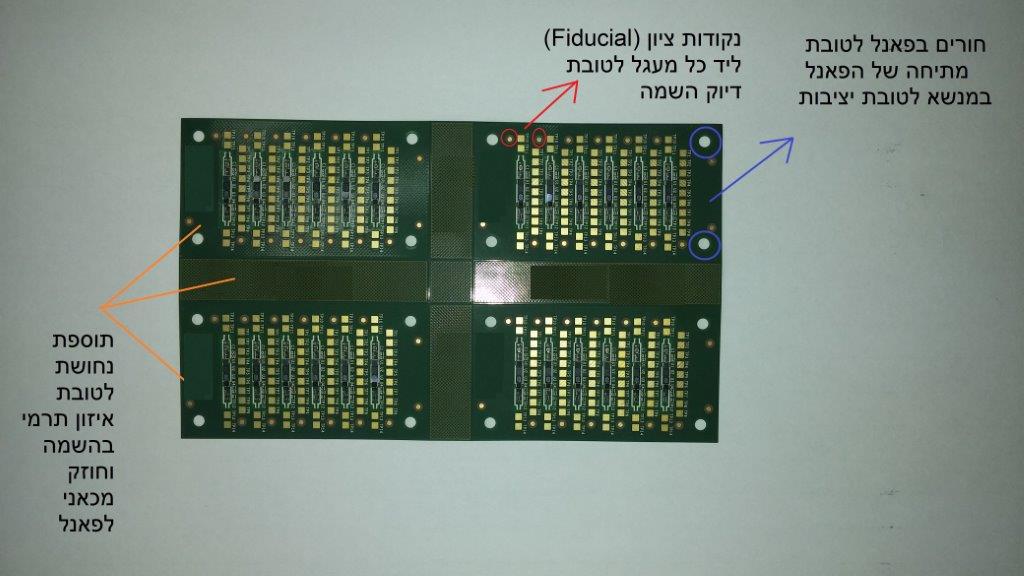 לאור זאת ששטח המעגלים בתוך הפאנל היה קטן משמעותית משטח הפאנל הריק, הוגדרו בשטחים הריקים קוביות נחושת (Copper Balance) כדי לאפשר איזון תרמי בתהליך החימום (Reflow) בקו הייצור וכן לאפשר חוזק מכאני ויציבות לפאנל. בנוסף, נוספו נקודת ציון (Fiducial) מקומיות ליד כל מעגל כדי לאפשר דיוק גבוה בתהליך ההשמה. (איור 3) הפאנל שהכיל 24 מעגלים, הוצמד למנשא קשיח אשר נשא אותו בתהליך ההשמה. הואיל ונדרש היה להצמיד את הפאנל בצורה חזקה ויציבה למנשא, תוכננו על הפאנל חורים ייעודיים לטובת מתיחה של הפאנל על המנשא.