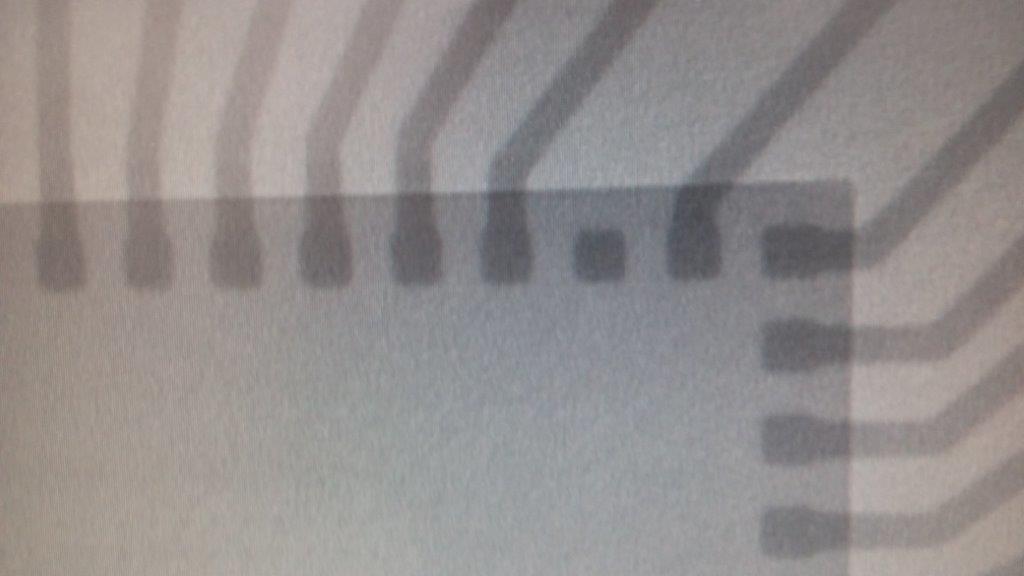 פתרון טכנולוגי לא פחות מאתגר היה עלינו למצוא לחברת הייטק ישראלית גם היא בתחום הרפואי אשר פיתחה רשתית אלקטרונית. החברה אשר דורגה ב-25 חברות הייטק המבטיחות באירופה (ע”י המגזין האירופאי CNBC), הינה חלום שמתגשם עבור מיליוני עוורים ברחבי העולם. מהנדסי החברה צלחו את מורכבות הפיתוח של המוצר החדשני אך נתקלו בקשיים לא מבוטלים בתהליך הייצור. המוצר מתבסס על רכיב אלקטרוני זעיר ביותר עם מרחק בין רגלים (Pitch) של 11 מיל! (0.275 מ”מ). רכיב זה הינו הרכיב האלקטרוני האקטיבי הקטן בעולם שהורכב בקו SMT נכון להיום. תהליך ייצור מעגל זה, שבוצע עד כה ע”י הלקוח, כלל לא פחות מ-4 ספקים שונים שעליהם היה לדבר בשפה אחת כדי לאפשר הלחמה מיטבית של הרכיב. הספק הראשון היה כמובן יצרן הרכיב, ספק שני הלחים בעזרת מיקרו-אלקטרוניקה כדוריות בדיל (Balls) לטובת הלחמה של הרכיב, הספק השלישי היה יצרן המעגל, הספק הרביעי ביצע את השמת הרכיב על המעגל. תהליך זה היה מסורבל, יקר ונמשך זמן רב. (8 שבועות). לאחר סיעור מוחות שביצענו בחברה בין גוף הייצור (אלטק) לגוף ההשמה (ניסטק מרכז) וגוף התכנון (ניסטק דיזיין), הוסק, כי ניתן להרכיב את הרכיב הנ”ל בתהליך ייצור סטנדרטי עם מספר פעולות יצירתיות. הוחלט לייצר מעגל אלקטרוני ללא SM (“גשרונים”) בין הפדים ולהרכיב את הרכיב כפי שהוא (ללא הוספת Balls) בתהליך השמה טיפוסי. לאור הדיוק הנדרש, בתהליך ייצור המעגל המוליך לא כוסה ב-SM אלא נותר חשוף. בניסוי ההשמה הראשון שבוצע הובחן כי קיימת חוסר הלחמה בפדים של הרכיב. לאחר ניתוח הנושא, נמצא כי הסיבה היא המוליך החשוף אשר עקב כוחות פני השטח “גנב” את הבדיל מהפד. לאור זאת בניסוי השני הוחלט לפתוח חור (aperture) גדול יותר במסכת ההלחמה, כך החור החדש כיסה גם את הפד וגם חלק מהמוליך, כדי לאפשר כניסת “לחם” גדולה יותר שתאפשר הלחמה מיטבית (איור 1). תוצאות ההלחמה של הניסוי השני (איור 2) אכן הראו כי חומר הלחם כיסה באופן מלא את הפד ובוצעה הלחמה תקינה.
