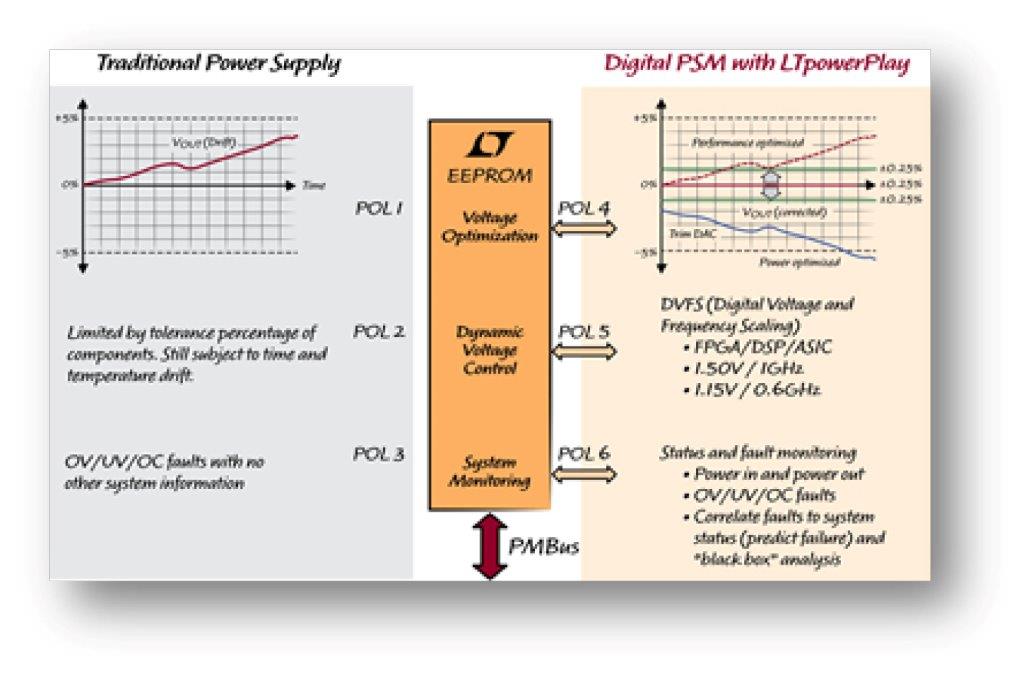 איור 4. ניתן להגדיר בקלות מוצר DPSM בכדי לכוונן בצורה מדויקת את ביצועי המערכת באמצעות ממשק GUI דוגמת ™LTpowerPlay בכדי למזער את בזבוז ההספק. זאת, על ידי טכניקות כגון מתח דינמי והתאמה של רמת התדר