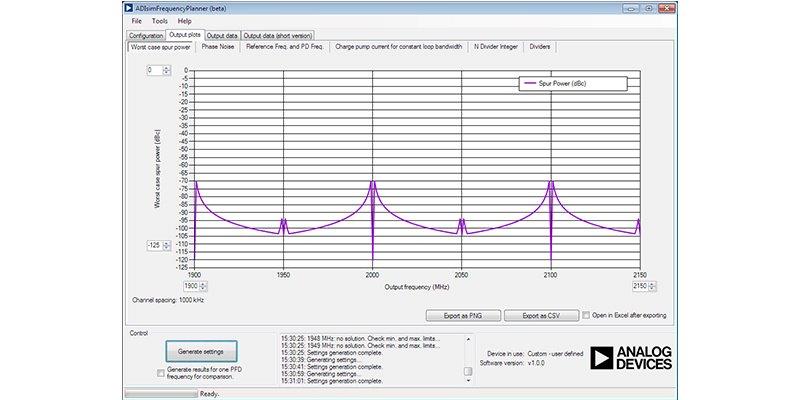 איור 1. הספק של המקרה הגרוע ביותר של דרבון גבול של מספרים שלמים בכל תדר מוצא מ-1900 מגה-הרץ עד 2150 מגה-הרץ (צעדים של 1 מגה-הרץ; רוחב-פס לולאה 100 קילו-הרץ; HMC830)