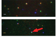 איור 5. למעלה: עירוי בו-זמני בכחול, ירוק ואדום של ה-DNA המשותק והמתויג מאפשר זיהוי התשלובת המורכבת במלואה. למטה: עירוי ב-488nm בלבד; בשל ה-FRET מצמדי ה-Holliday הראו אותות בכל שלושת ערוצי הצבעים (קנה מידה: 1 מיקרומטר)