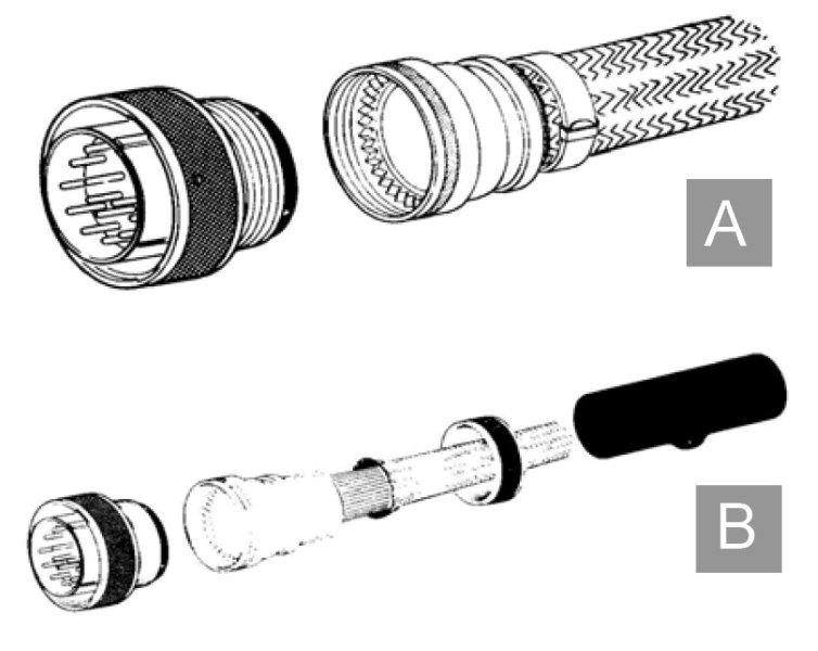לסיומת הסיכוך (אופן חיבור הסיכוך למחבר או להארקה) יש חשיבות גדולה בהשגת אימפדנס מעבר נמוך ויעילות סיכוך טובה. עבור סיכוך חיצוני של כבל יש לדאוג לחיבור היקפי (3600) של מיוחד לכך. איור 3 מתאר אופני חיבור הסיכוך לגוף המחבר תוך שימוש ב-EMI BACKSHELL היקפי. במקרים רבים לא ניתן להשתמש בסיכוך כולל על הצמה, בייחוד בציוד מוטס וחללי אשר בהם קיימים אילוצי משקל גבוהים. כמו-כן, לחיווט דינאמי אל גימבלים במכלולים נעים יש מגבלה על הרכבת סיכוך חיצוני מסיבי בשל מומנט הפיתול שהסיכוך יוצר. במקרים כאלה ניתן להשתמש בחוטים בודדים מסוככים או זוגות מסוככים. במקרים אלה יש חשיבות לאיסוף הקצוות. המסוככים והארקתם לגוף היחידה. התקנים לחיבור הסיכוכים מתוארים באיור 4 ובאיור 5. איור 3(a) מתאר SHRINK BOOT, EMI/RFI, STRAIN RELIEF מתאם זה מספק שיטה פשוטה להארקת הסיכוך הכולל. הצמה/הסיכוך הכולל הנעולה בין חוט LAMP-BASE זכר לחוט LAMP-BASE נקבה, מספקת חוליית קישור טובה. איור 3(b) מתאר SHRINK BOOT, EMI/RFI, SHIELD SOCK. למתאם זה מחובר סוקט מסוכך לאחורי גוף המתאם אשר מחובר לצמה הכוללת של הכבל או הרתמה. איור 4 מתאר TAG-RING BACKSHALLS טבעת BACKSHALL מציעה שיטות מהימנות לטרמניציית חוטי סיכוך כאשר הסיכוכים מוארקים דרך ה-BACKSHALLS ודרך מעטפת המחבר. איור 5 מתאר RFI G-SPRING BACKSHALLS .BACKSHALLS אלה מספקים שיטה חדשנית לטרמינציית ולהארקת הסיכוך הכולל וסיכוך FOIL על קווי כבלים ורתמות. תכנון ה-G-SPRING מספק קפיץ היקפי הדחוס כנגד הסיכוך החשוף לביצוע הארקה חשמלית חיובית סביב כל היקף הסיכוך.