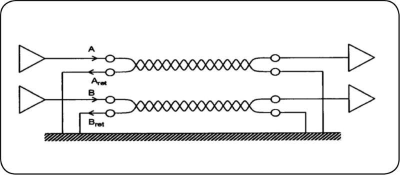 כל הקווים החוזרים יהיו מצומדים לקווי האות או המתח שלהם, בעיקר על-ידי פיתול, כיוון שזה מפחית את צימוד השדה המגנטי למעגל. קווים חוזרים לעולם לא יחולקו בין קווי אות ומתח, ובוודאי לא בין קווי אות בודדים, בעלי אופי שונה, כיוון שזה גורם לצימוד אימפדנס משותף. חוטי אדמה נוספים יכולים לעזור בהקטנת CROSSTALK קיבולי בכבל. לא ברור אינטואיטיבית כי זרמי החזרה יזרמו בהכרח במוליך כאשר ישנן מספר אפשרויות של מסלולי חזרה. ב-DC, זרמי החזרה למעשה מחולקים רק על-ידי יחס התנגדויות המוליכים. אך ככל שהתדר עולה, ההשראות ההדדית של הזוג המצומד תגרום להפחתת נוכחות האימפדנס לזרם. החזרה על-ידי החזרה המקומית שלו בהשוואה למסלולים אחרים, כיוון ששטח הלולאה הסגורה קטן ממסלול זה (איור 7) הזרם בתדר גבוה חוזר דרך קו ה-RTN המפותל ולא דרך האשייה וזוהי הסיבה העיקרית לשימוש בכבל TWISTED PAIR להעברת נתונים. כמו כן, השפעה זו גם אחראית לתכונות סיכוך מגנטי של כבל קואקסיאלי.
