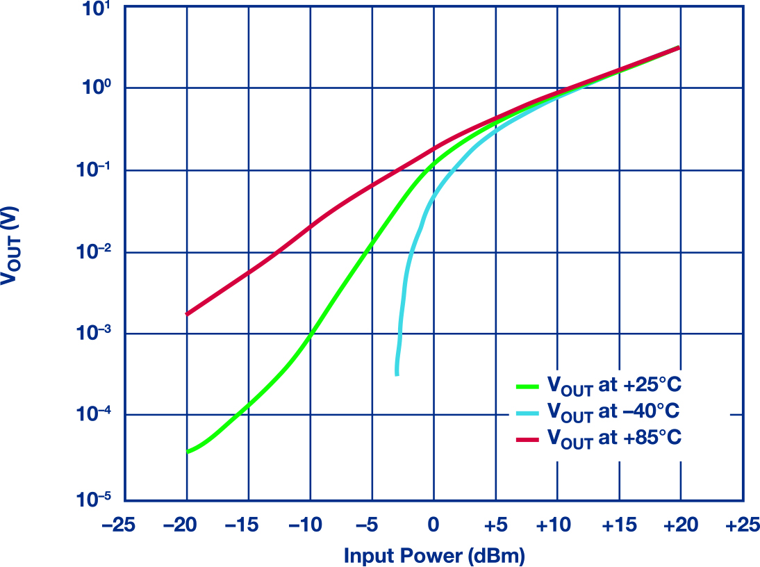 מתחת ל-0, מתחיל האזור המכונה אזור החוק המרובע. באזור זה, מתח המוצא יחסי בקירוב לריבוע מתח המבוא. דבר זה גורם לשיפוע גבוה יותר על העקום. איור 2 גם מראה את מתח המוצא כנגד פונקציית המעבר של הספק המבוא של המעגל כאשר הטמפרטורה נעה בין 400C ל- +850C. דבר זה מציג סטייה משמעותית ברמות ההספק מתחת ל-0. הדבר הופך את ההתקן לבלתי שימושי ביישומים בהם הטמפרטורה משתנה בשינוי משמעותית כלשהו. קיימות טכניקות שניתן להשתמש בהן כדי למתן סטיית טמפרטורה זו. הן כוללות הכנסת דיודת ייחוס שנייה הן כחלק של המעגל והן כמעגל עצמאי בעל מוצא משלו. סטיית הטמפרטורה של דיודת הייחוס תואמת את זו של הדיודה הראשונית. בעזרת תהליך חיסור (הן במישור האנלוגי והן במישור הדיגיטלי, על-פי מבנה המעגל) ניתן להשיג דרגה מסוימת של ביטול הסטייה. איור 3 מראה את פונקציית המעבר ב-25 גיגה-הרץ של ADL 6010, גלאי מבוסס-דיודות Schottky בעל מספר תכונות חדשניות. כחלק של עיבוד האותות, אות המבוא עובר דרך מעגל המבצע פונקציית ריבוע-המעגל רק באותות מתחת לרמת הספק מסוימת. נקודת המעבר נקבעת במתכוון להיות שווה לרמת ההספק בה הדיודה עוברת מאזור חוק הריבוע לאזור הליניארי. כתוצאה מכך, השפעת חוק הריבוע של הדיודה מבוטלת ואין שום סימן מפונקציית המעבר בעלת שני אזורים הברורה כל כך באיור 1. איור 3 גם כולל עקומות המראות את פונקציית המעבר בטמפרטורות שונות מ 550C- עד +1250C. השינוי בפונקציית המעבר כנגד הטמפרטורה מוצג גם כן. תוך שימוש בנסיגה הליניארית של פונקציית המעבר של 250C כייחוס, השגיאה בכל טמפרטורה מוצגת ב-dB. כתוצאה ממעגל קיזוז הטמפרטורה ומעגל הביטול של חוק הריבוע, אנחנו רואים שגיאות בגין הליניאריות וסטיית הטמפרטורה של בערך ±0.5 על פני רוב תחום המבוא.