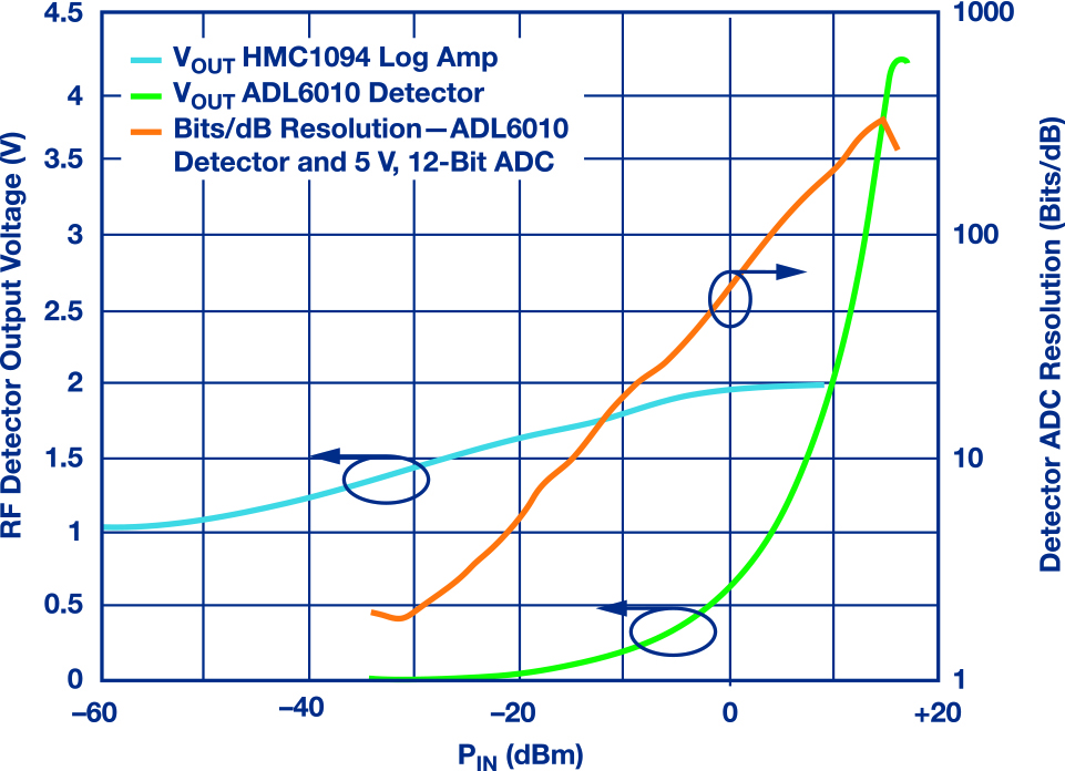 מאחר שלממירים אנלוגיים לדיגיטליים יש פונקציית מעבר הנמדדת בביטים/מתח, פירוש הדבר הוא שרזולוציית המערכת במונחים של dB לביט יורדת ברציפות עם הפחתת הספק המבוא. העקומה באיור 5 מראה גם את הרזולוציה של ביטים ל-dB שניתן להשיג אם ה-ADL6010 היה מניע ADC של -12ביט עם מתח בסקלה מלאה של 5 וולט (עקומה זו מוצגת בציר משני לוגריתמי לשם נוחות התצוגה). בצד הנמוך של תחום ההספק של ההתקן, מסביב ל–25, השיפוע ההפרשי יהיה בערך 2 ביטים ל-dB, הגורם לרזולוציה של בערך 0.5dB/bit. מכאן נובע ש-ADC בעל 12 ביט מתאים להמרת מוצא ה-ADL6010 לאורך התחום המלא. כאשר הספק המבוא RF עולה, השיפוע ההפרשי בביטים ל-dB עולה בהתמדה לערך של כ-300 בהספק מבוא מרבי של 15dBm. דבר זה חשוב ביישום של בקרת הספק RF כאשר הדיוק הוא הקריטי ביותר בשעה שהמערכת נמצאת בהספק מרבי. זהו תרחיש אופייני מאוד ביישומים בהם גלאי ה-RF משמשים למדידה ובקרה של ההספק של מגבר הספק גבוה (high power amplifier – HPA). ביישומים בהם ההספק מבוקר לעתים קרובות כדי למנוע את ה-HPA מחימום-יתר, מדידת ההספק ברזולוציה גבוהה בהספק מרבי היא בעלת ערך גבוה.