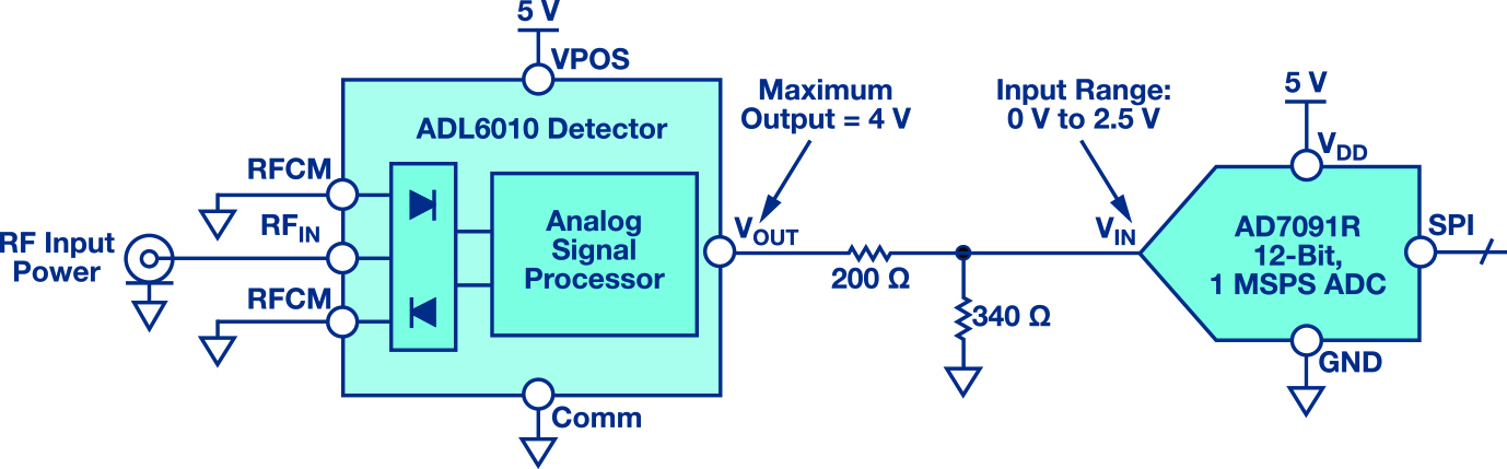 בניגוד לכך, פונקציית המעבר של המגבר הלוגריתמי HMC1094 באיור 5 מראה גם שיש לו שיפוע קבוע על-פני תחום הפעולה הליניארי שלו. דבר זה מרמז ש-ADC בעל רזולוציה נמוכה יותר (10 ביט או אף 8 ביט) יהיה מתאים כדי להשיג רזולוציה הרבה מתחת ל-1. איור 6 מראה מעגל יישום בו ה-ADL6010 ממושק ל-ADC בעל 12 ביט מדויק יכול לדגום עד 1. ל-ADC יש ייחוס פנימי של 2.5 וולט הקובע את מתח המבוא בסקלה מלאה. מאחר שהגלאי ADL6010 יכול להגיע למתח מרבי של כ-4.25 וולט, מחלק נגדים פשוט משמש להפחתת המתח כך שלא יעלה לעולם על 2.5 וולט. ספירה זו ניתנת למימוש ללא צורך בחוצץ של מגבר תפעולי. הרזולוציה שניתן להשיג במונחים של dB לביט בצד התחתון של תחום הספק המבוא דומה לדוגמה דלעיל (כלומר בערך 0.5dB לביט) 2.