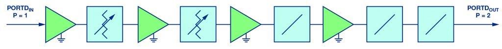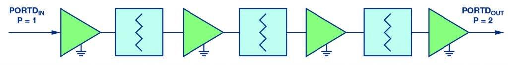 לבסוף, ניתן להוסיף שיוויונים למוצא ההתקן. שיוויון המוצא מקטין את הספק המוצא, אך הוא לא ייצור פילוג של התחום הדינמי המגביל. שיוויון המוצא יוצר שיפוע מוצא חיובי במקצת, אך שיפוע זה מקוזז על-ידי המארז בתדר גבוה והפסד המחבר. מערך של מגבר מגביל בעל ארבע דרגות מוצג באיור 9. איור 10 מציג את תוצאת ההדמיה של הספק מוצא לעומת הטמפרטורה עבור ה-HMC7891 של ADI. התכנון הסופי משיג תחום דינמי של 40dB והוא בעל שינוי מוצא במקרה הגרוע ביותר של 3dB בכל תנאי הפעולה.