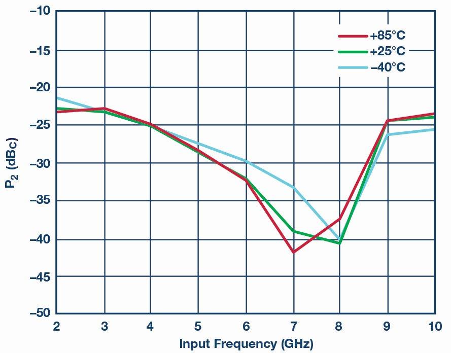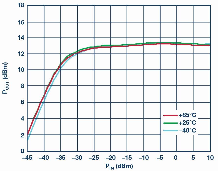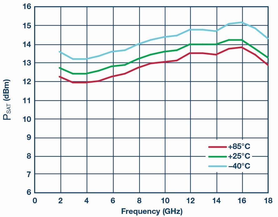 45±1.5dB, תחום טמפרטורות פעולה של -40 עד 850C, פחות מ-1.5 ואט DC, ותחום דינמי מגביל של 40dB. תחום דינמי מגביל מוגדר כתחום הספק המבוא בו נקבע הספק המוצא RF. ADI מציעה מוצר של מגבר מגביל רחב-פס 2-18 גיגה-הרץ, ה-HMC7891, אשר עונה לדרישות אלו. מגבר זה כולל ויסות מתח פנימי במארז בעל מחבר אטום הרמטית.
