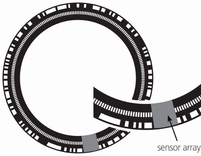 כדי לקרוא את המסילה האבסולוטית קוראים מספר חיישנים את השנתות הרציפות של הדפוס. על המרחק בין חיישנים סמוכים להיות שווה לשנתות של המסילה האבסולוטית או לאורך המקטע המחזורי של המסילה האינקרמנטלית. בשל ממדיהם הקטנים של חיישנים אלו, מותקנים בדרך כלל חיישנים אופטיים מיניאטוריים ומותאמים אישית כמערך חיישנים על גבי שבב מוליך-למחצה. איור 3 מציג דוגמה לסידור החיישנים באנקודר אבסולוטי.