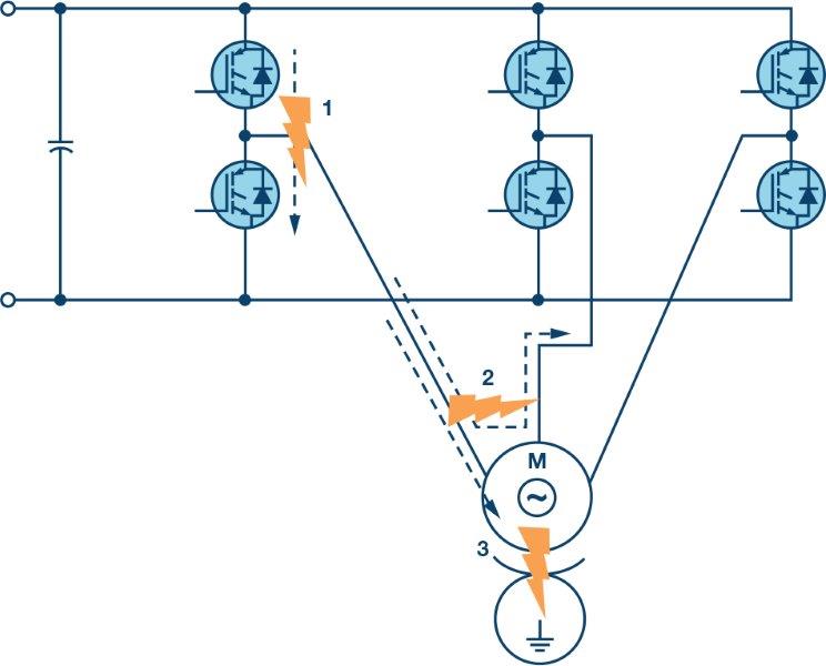 הזנות של מנועים תעשייתיים יכולות לפעול בסביבה נוקשה יחסית בה ניתן למצוא טמפרטורה גבוהה, תופעות מעבר של קווי ac, עומס-יתר מכני, חיווט מוטעה ואירועים אחרים. אחדים מאירועים אלה יכולים לגרום לרמות זרמי-יתר גבוהות הזורמים במעגלי ההספק של הזנת המנוע. שלושה אירועים של קצרים אופייניים מוצגים באיור 1.