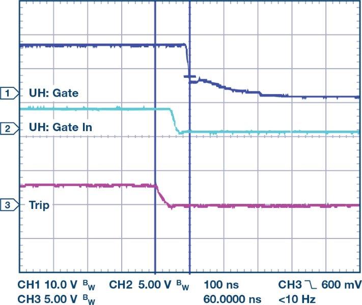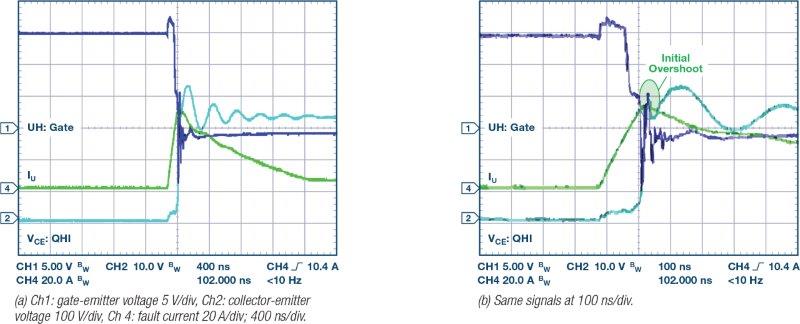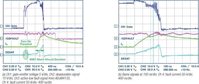 גילוי ה-desaturation של מזין השער עשוי לפעול משמעותית מהר יותר מאשר שיטות גילוי זרם היתר המתוארות לעיל, והוא חשוב כדי להגביל את מידת זרמי הקצר המותרת לעלות, ובכך מוגברת אמינות המערכת הכוללת מעל הרמות שניתן להשיג אפילו בהגנת זרם יתר מהירה. דבר זה מוצג באיור 7. בשעה שהכשל קורה, הזרם מתחיל לגדול במהירות – למעשה הזרם הוא הרבה יותר גבוה מאשר מוצג כאשר המדידה נלקחת עם חיישן זרם של 20 אמפר מוגבל ברוחב-פס לשם הדגמה בלבד. מתח ה-desaturation מגיע לרמת מהלך של 9 וולט ומזין השער מתחיל להיכבות. ברור שהמשך הכולל של הקצר הוא פחות מ-400 ננו-שניות. הזנב הארוך של הזרם הוא הדעיכה של האנרגיה ההשראתית על-ידי המהלך החופשי של הזרם בדיודה האנטי-מקבילה של ה-IGBT הנמוך יותר.