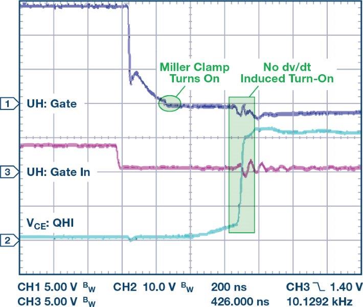 איור 8 מראה את מתח הקולט-פולט על-גבי ה-IGBT. קיימת כאן עליית-יתר התחלתית של כ-80 וולט מעל מתח האפיק של 320VDC בשל העכבה הגבוהה יותר בכיבוי במהלך ההגנה בפני desaturation. התנועה של הזרם בדיודה האנטי-מקבילה וטפילות המעגל גורמות למעשה לעליית יתר מעט גבוהה יותר עד כדי כ-420 וולט.