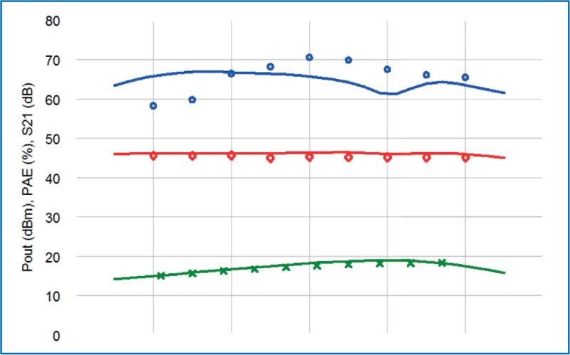 15 פורסם ע"י New-Tech Magazine on נובמבר 2, 2016 800 × 499סימולציה ככלי לתכנון מגבר הספק רחב סרט בטכנולוגית GaN איור 15. תוצאות הסימולציה (משורטט בקו רציף) מול תוצאות המדידה (נקודות) : הספק מוצא (אדום), PAE ( כחול), S21 (ירוק) ← קודם הבא →