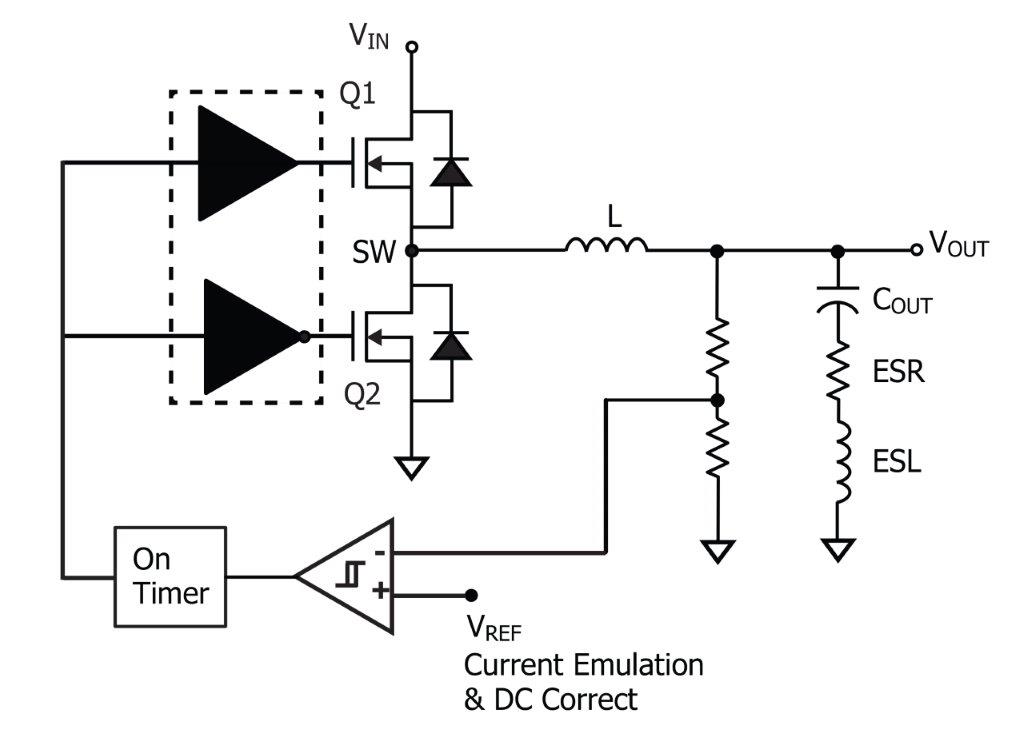 - איור 1. סכמת מעגל פונקציונלית מפושטת של ספק כוח ממותג COT מסוג Buck (step-down)