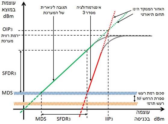 התגובה הליניארית של המערכת מוצגת בקו ירוק עם שיפוע של 1, החיתוך של הקו עם ציר Y מייצג את ההגבר של המערכת (G) ב-dB. ה-MDS נקבע על ידי הרעש התרמי בתוספת ספרת הרחש (במקרה שרוחב הסרט של האות עדיין לא הוגדר). הקו האדום מיצג את האינטרמודולציה מסדר שלישי ובעל שיפוע של 3.