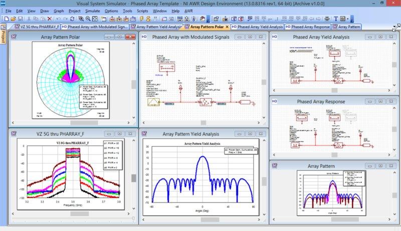 כלי התכן ™Visual System Simulator הוא כלי לסימולציה ברמת המערכת המשולב בפלטפורמת סביבת הפיתוח של נשיונל אינסטרומנטס – NI AWR. כלי זה בעל יכולת לביצוע אנליזה של מערך מלא של אנטנות אקטיביות (איור 2). הסימולטור מספק מידע על ביצוע המערכת השלמה, כפונקציה של כיוון האלומה המוזזת, תכן האנטנה והאלמנטים האקטיביים והפסיביים הכלולים במעגלי הזזת האלומה.