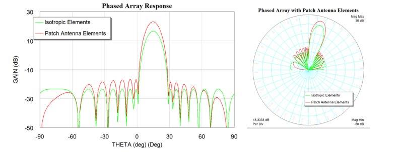 בדוגמא זו נעשה שמוש ב- gain tapers מסוג Chebychev עם יחס אונות צד של 40dB על מנת לעצב את היענות המערך ביחס לזווית off boresight. התוצאה עבור שני המערכים הללו משורטטים זה לצד זה על מנת להדגים את האפקט של עקומת הקרינה של האלמנט על ההיענות הכללית של המערך. (איור 7)
