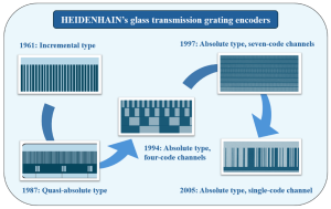 איור 1: התפתחות סדרת האינקודרים הליניאריים מזכוכית של HEIDENHAIN לאורך השנים. (Figure 1 – The development history of HEIDENHAIN’s glass transmission linear encoders.) מקור: Zhao M., Yuan Y., Luo L., Li X., Sensors 2025, 25(19):5997 © HEIDENHAIN GmbH, באדיבות MDPI (CC BY 4.0)