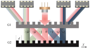 - שיטת Diffraction Grating – שימוש בעקרון העקיפה של קרני אור דרך סרגל מחורץ ברזולוציה ננומטרית. האור הנשבר נמדד ע״י גלאים, והפרש הפאזה משמש למדידת מרחק. טכנולוגיה וותיקה אך עדיין פסגת הדיוק.