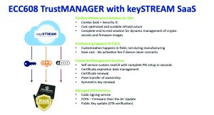 ECC608-TMNGTLS הוא גרסה של שבב האימות הקריפטוגרפי 608ECC שמגיעה מראש עם מפתחות קריפטוגרפיים כדי להתחבר ל-keySTREAM SaaS. בעת הפריסה, מכשיר ה-IoT המכיל את ה-ECC608-TMNGTLS יתחבר ל-keySTREAM SaaS, ויעניק את הבעלות על מכשיר ה-IoT לבעליו המיועד באמצעות הקצאה בשטח עם PKI מותאם אישית. אפשרות זו מספקת גישה אלגנטית וללא מגע ידני, ללא צורך בהגדרה ידנית של החלפת המפתחות. ניתן לנהל אותם מרחוק בתוך הגבול הפיזי של ה-IC של האימות המאובטח לאורך מחזור החיים שלו.