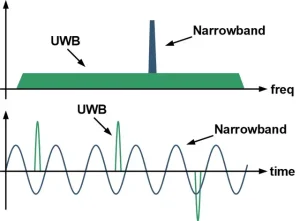 UWB פועלת בדרך כלל בטווח תדרים רחב (כ-6–10GHz) וברוחבי ערוץ של כ-500MHz ואף יותר. רוחב הסרט הגדול מאפשר רזולוציית זמן גבוהה במיוחד, ולכן גם דיוק ranging גבוה בהרבה. בפועל, מערכות UWB מודרניות מסוגלות לספק מידע מיקום ברמת דיוק של סנטימטרים ואף מילימטרים, בין משדר (TX) למקלט (RX) הנמצאים במרחקים אופייניים של כ-10–15 מטרים.